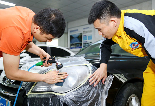 ①准备大灯翻新工具及设备、大灯清洗、大灯翻新工艺、大灯装车检查、质检交车;